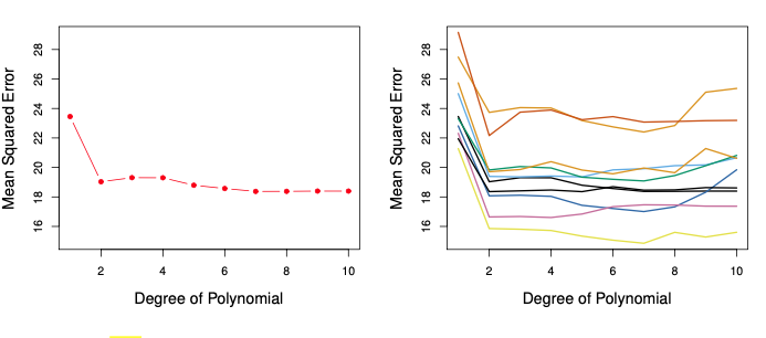$10$개의 곡선 모두 2차 항을 포함한 모델이 선형 항만을 가지는 모델에 비해 훨씬 작은 검증셋 MSE를 갖는다. 더욱이, $10$개의 곡선 모두 3차 또는 더 높은 차수의 다항식 항을 모델에 포함하는 것이 별로 이득이 없다는 것을 보여준다. 그러나 $10$개의 곡선 각각은 고려된 $10$개의 회귀 모델에 대해 서로 다른 검증 MSE 추정치를 제공한다. 어느 모델이 가장 작은 검증 MSE를 제공하는지에 대해 $10$개 모델 사이에 일치된 결과는 없다. 이 곡선들 사이의 변동을 기반으로 내릴 수 있는 결론은 선형 적합이 이 데이터에 적절하지 않다는 점이다.
