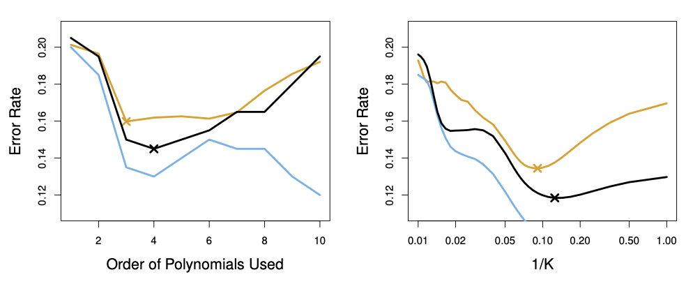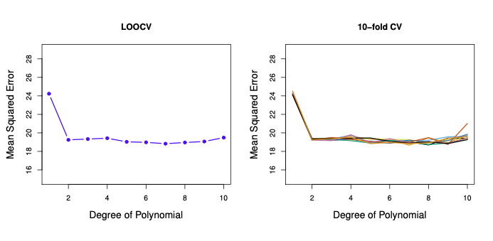 훈련 오차는 적합의 유연성이 증가함에 따라 감소하는 경향이 있다. 이에 반해, 검정 오차는 U-형태를 보인다. 10-fold CV 오차율은 검정 오차율을 아주 잘 근사한다. 이는 오차율을 다소 과소 추정하지만, 4차 다항식이 사용될 때 그 값이 최소가 된다. 10-fold CV 오차율의 최소값은 3차 다항식이 사용될 때 얻어지는 검정 오차 곡선의 최소값과 매우 가깝다. 사실, 4차 다항식을 사용하는 것은 실제 검정 오차율이 3차~6차 다항식에서 거의 동일하기 때문에 좋은 검증셋 성능을 보일 것이다.