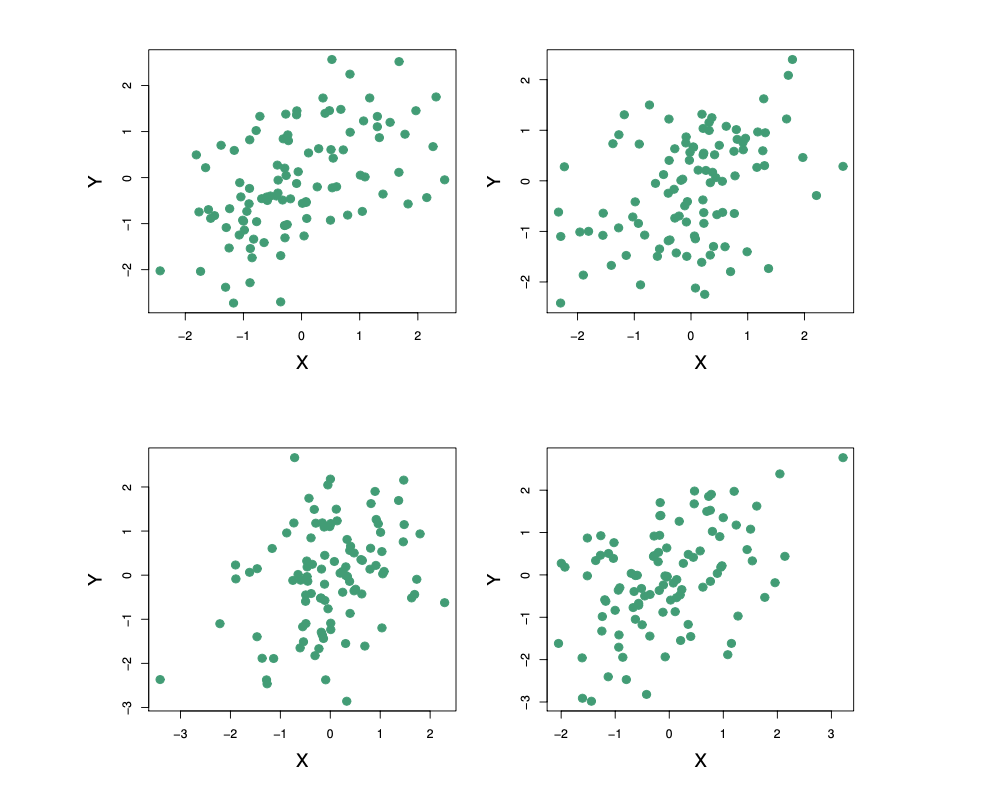 그림 5.9는 모의 자료에 대한 $\sigma$를 추정하기 위한 기법을 보여준다. 각 패널에는 $100$개의 $X$와 $Y$에 대한 모의 투자 수익이 표시된다. 이 모의 투자 수익을 사용하여 $\hat{\sigma}_X^2, \hat{\sigma}_Y^2, \hat{\sigma}_{XY}$를 추정하고, 이 추정치들을 (5.7)에 대입하여 $\sigma$에 대한 추정치를 얻는다. 각 모의 자료로부터 얻은 $\hat{\sigma}$ 값의 범위는 $[0.532, 0.657]$이다.