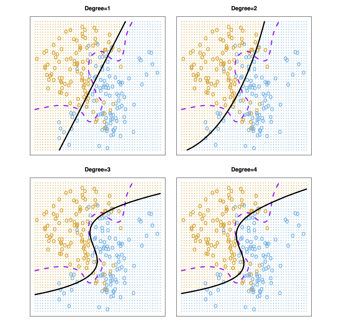 식 (5.5)의 결정 경계는 그림 5.7의 오른쪽 위 패널에 나타난 곡선 형태이다. 그러나 검정 오차율은 $0.197$로, 단지 약간만 개선되었다. 왼쪽 아래 패널에는 훨씬 많이 개선된 결과를 보여주는데, 이는 설명 변수들의 3차 다항식을 포함한 로지스틱 회귀모델을 적합한 결과이며, 검정 오차율은 $0.160$까지 줄어들었다. 4차 다항식을 사용하면 검정 오차율이 약간 증가한다.