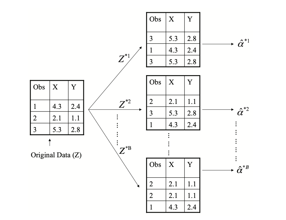 이 예제에서 $Z^{*1}$은 세번째 관측치를 두 번, 첫 번째 관측치를 한 번 포함하며, 두 번째 관측치는 포함하지 않는다. 만약 어떤 관측치가 $Z^{*1}$에 포함되면 그 관측치의 $X$및 $Y$ 값 둘 다 포함된다. $Z^{*1}$을 사용하여 $\hat \sigma^{*1}$라는 $\sigma$에 대한 새로운 붓스트랩 추정치를 얻을 수 있다.