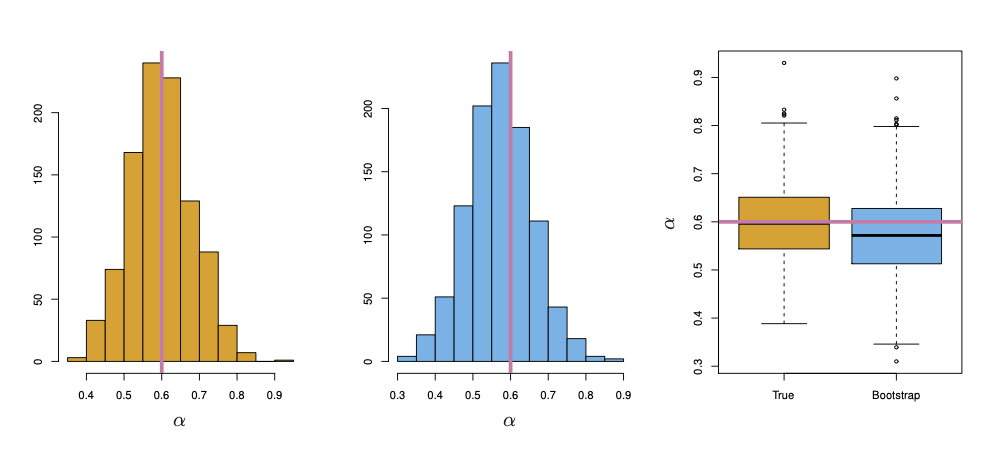 그림 5.10의 중앙 패널에는 $\sigma$에 대한 $1000$개 붓스트랩 추정치의 히스토그램이 도시되어 있다. 각 추정치는 상이한 붓스트랩 데이터셋을 사용하여 계산된다. 이 패널은 하나의 데이터셋을 기반으로 생성되었으므로 실제 데이터를 사용하여 얻을 수 있다. 히스토그램은 실제 모집단으로부터 $1000$개의 모의 데이터셋을 생성하여 얻은 $\sigma$의 추정치에 대한 이상적인 히스토그램을 나타낸 왼쪽 패널과 매우 유사하다.